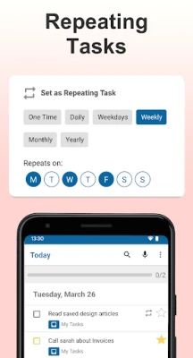 • Repeating tasks: create tasks to repeat Weekdays, Weekly, Monthly or Yearly with flexible custom options