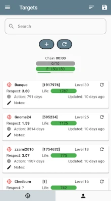 * Create your own target list, adding your own comments and many other details. Import and export your targets to/from YATA. While chaining, automatically skip targets that can't be attacked (hospitalised/jailed or in a different country). Get optimal targets directly from Torn Attack Central, included in the Chaining section. Chaining has never been easier.