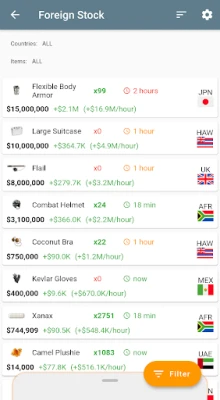 * Have a look at foreign stocks directly in the Travel section. Filter and sort items at your convenience, including profit based on item capacity. Also, by using the in-app browser, you are contributing by sending stock data automatically to the shared database!